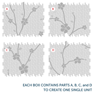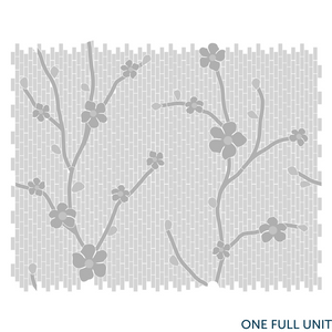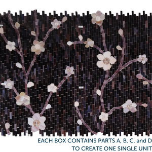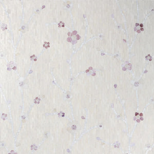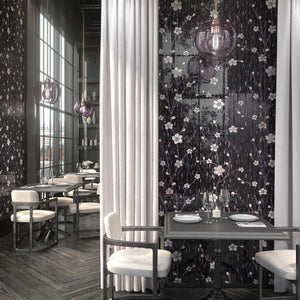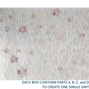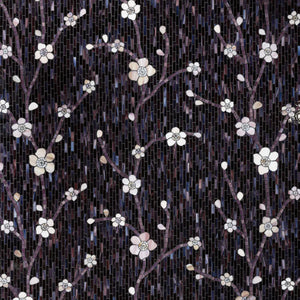 CHERRY, a stunning Jazz Glass mosaic, mirrors the ephemeral beauty of Japanese cherry blossoms. The pink-hued springtime flora embodies fragility and effortless allure with delicate, blushing petals. CHERRY encapsulates this essence in an intricate creation, harmoniously blending soft, iridescent colors that reflect both light and color. Dark CHERRY features a background in Dizzy Plum Jazz Glass, adorned with Parish Purple stems and flowers in Mulberry Jam, Pink Lady & Rose Blush. Light Cherry consists of a Moonbeam Matte background, with stems in Veined White, Café Cream and Rose Blush flowers, and buds in Pink Lady & Rose Blush. This all-over glass mosaic is stocked in 30-1/8"x 24" x 1/8" interlocking sheets.