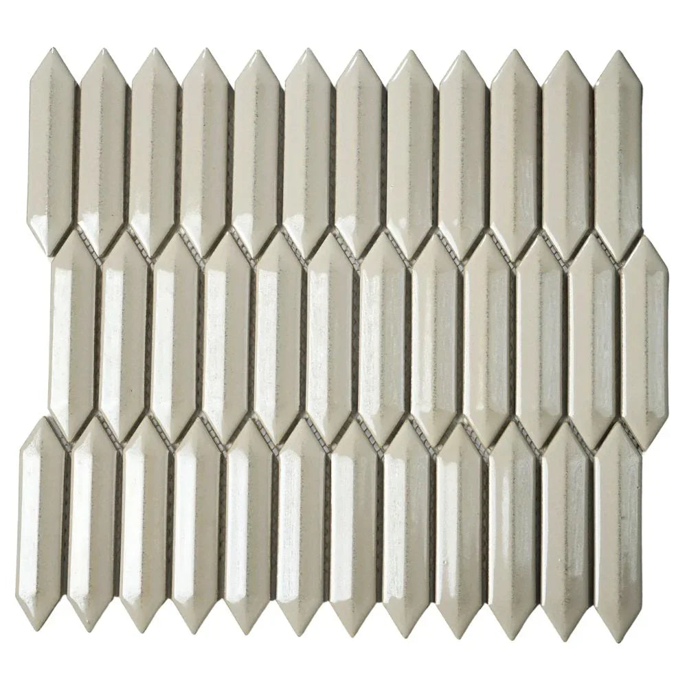 PITCH is a glazed porcelain wall tile collection with an antique flair and modern twist. Featuring elegant picket mosaics in a soft taupe tile palette, this versatile series brings depth and dimension to any design. The 3D mosaic tile surface creates visual interest, while the porcelain picket tile format offers durability for residential and commercial spaces. Perfect for kitchens, bathrooms, and accent walls, PITCH mosaic tiles transform spaces with timeless style and modern charm.