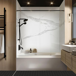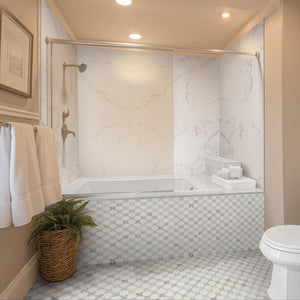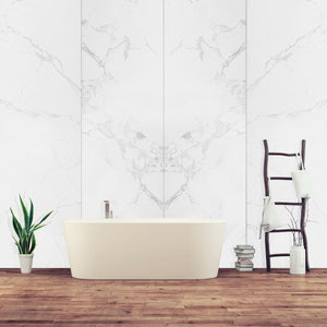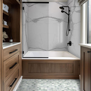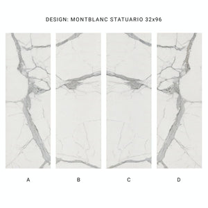 Type: Porcelain Item Code: 24824824966 Description: 31.5x94.5 Pre-Fab Emerge Montblanc Statuario Polished 4 Panel Tub/Shower Surround Set Availability: Special Order Lead Time: 3-4 weeks Purchase By: SET - $2,349.25, 1.0 sq. ft.