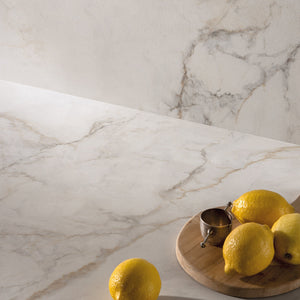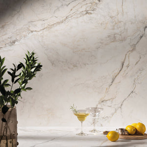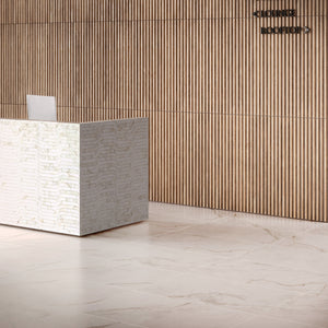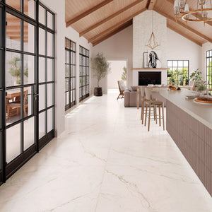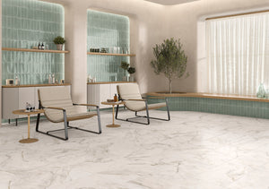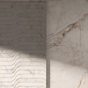 OPALINE is a collection of calacatta gold marble-look porcelain tile with a white background streaked with gray and gold veins reminiscent of apuano marble. This elegant stone-look porcelain tile is great for elevating a room and adding a touch of sophistication. Let the array of sizes and mosaics be your muse, as you create your own masterpiece in natural or polished marble.