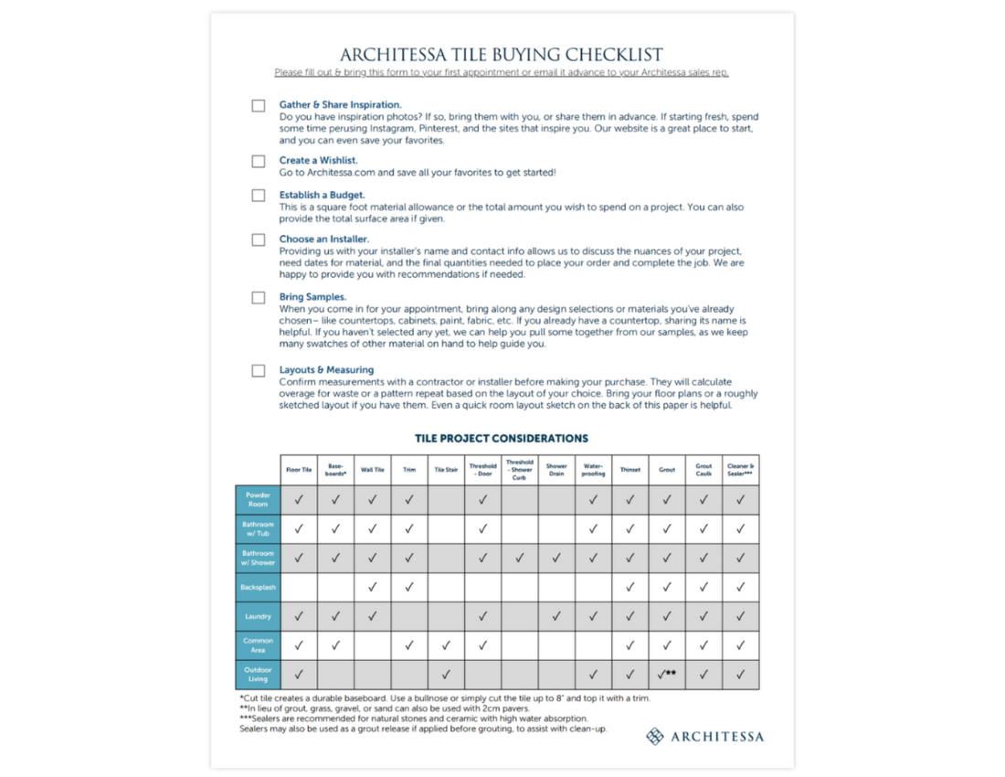 Prepare for your showroom appointment in advance by completing our Tile Buying Checklist before your visit.