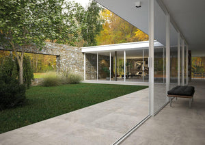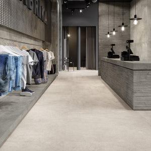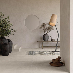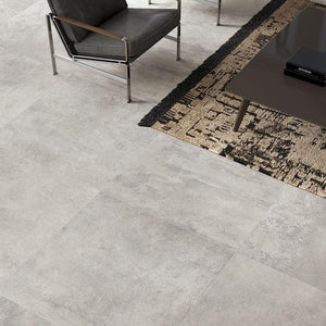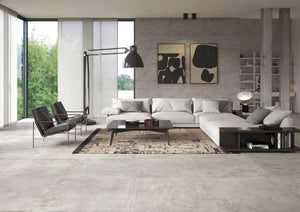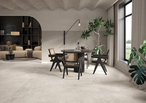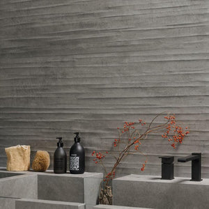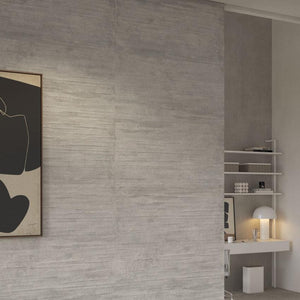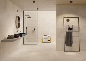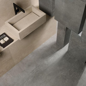 ALCHEMY is a collection of salvaged porcelain tiles with a concrete look featuring surface irregularities that reflect the passage of time. Available in four colors—White, Sand, Grey, and Dark Grey—and in various sizes including 40x40, 24x48, 24x24, 12x24 field tiles and two mosaic sizes. The collection also offers a 24x48 three-dimensional decor tile with horizontal lines, adding volume and tactile intensity. An anti-slip Natural finish is offered in the 40x40 and 32x32 sizes.