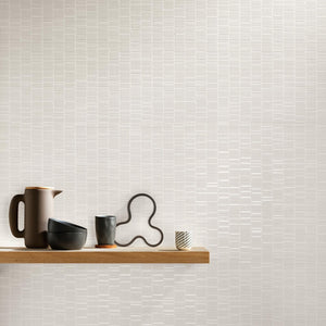 The collection boasts two distinct textures, Mini Dots, and Stripes, both magnificently complemented by the generous 20x48" format. A palette of five powdery colors - White, Cream, Canvas, Lichen, and Denim- adds a touch of elegance to your space. Crafted from delicately shiny embossed materials, Minidots and Stripes tiles exhibit an intriguing interplay of opacity and shine, responding to the light with an earthy, tactile impression. Redefine your interior with these modern, textured wall tiles from APLOMB. This tile is an excellent choice for kitchen backsplash tile, bathroom tile, kitchen tile, and other wall tile.