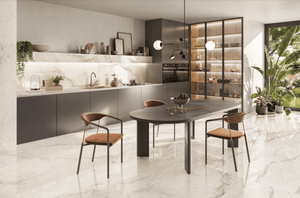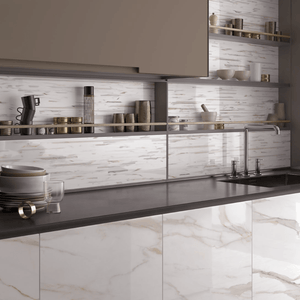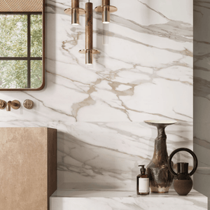 ART HOUSE RELOADED is luxury marble porcelain that does not disappoint. Achieve the natural stone look of coveted calacatta marble along with the durability and low maintenance of porcelain. ART HOUSE RELOADED comes in multiple sizes and colors with stunning deco large format and slab tiles as well as mosaics. Larger tiles make a small room look bigger.