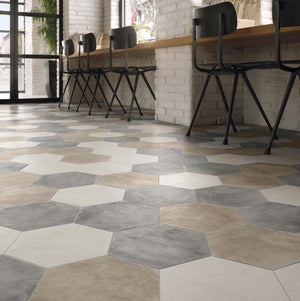 Inspired by the metropolitan characteristics of cement, ATTITUDE porcelain tiles anticipate exclusive trends for interior design thanks to their soft finish and delicate shades of color. Any project is enhanced by these hexagonal shapes and vintage decorative elements.