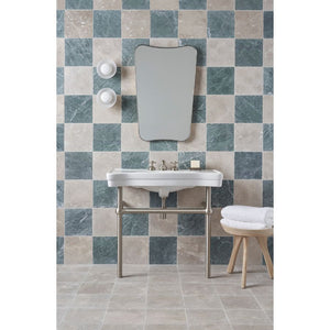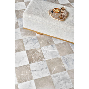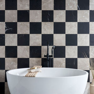 CHECKERBOARD is a collection of 10x10 natural tumbled natural stone tiles designed to be arranged in a checkerboard pattern. Checkerboard floors and backsplashes have become increasingly popular in recent years, making checkerboard tile a trending design element. These tumbled marble tiles come in 4 colors - elegant white carrara marble, neutral coastal grey marble, tantalizing moss green marble, and the dark tulip black marble. CHECKERBOARD marble tile takes the pattern to the next level by adding the soft look of tumbled marble into the mix, creating unparalleled contrast & texture. Pick a checkered floor tile that stands out from the rest with CHECKERBOARD.