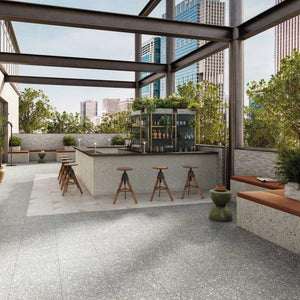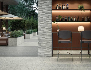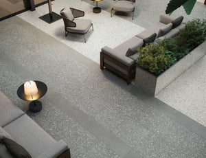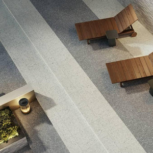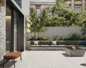 This line of terrazzo-look 2cm porcelain paver tiles are designed to be used outdoors, offering great durability & high slip resistance. Terrazzo is an incredible material, but real terrazzo is rarely installed outdoors due the complicated installation of poured terrazzo and the cost of pre-cast terrazzo. These porcelain terrazzo-look tiles achieve the same aesthetic at a lower cost with improved durability for outdoor living spaces such as paver patios, paver walkways, and paver tile pool decks.