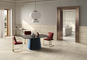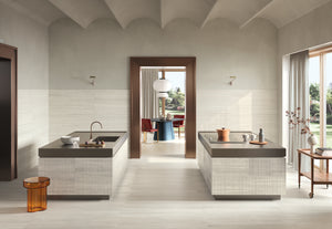 ORLA isn't just about floors and walls; it's a canvas for customized volumes and furnishings. The 24”x48” format encourages expressive design freedom, while the 12”x24” Vertical deco tiles allow for wainscoting, niches, bed headboards, and kitchen base cabinets. These ceramics are not just visually captivating; they're also durable and functional, ideal for both residential and commercial spaces. Non-absorbent, non-slip, and resistant to mechanical stress, staining, moisture, and high temperatures, ORLA stands the test of time and intense foot traffic, making it a practical and chic choice for modern interiors.