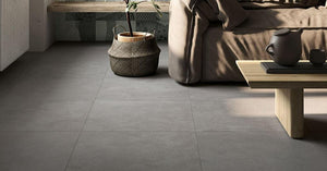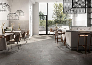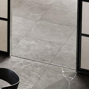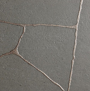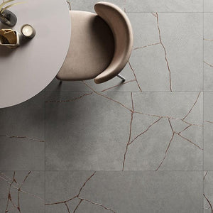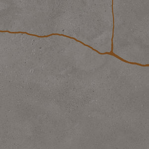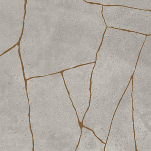 OSAKA concrete-look ceramic tiles are inspired by the Japanese art of repairing broken pottery with golden lacquer. OSAKA celebrates the organic sophistication of re-composition with golden veining across its textured surfaces.