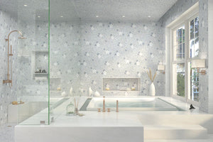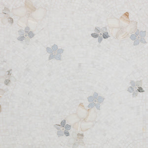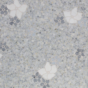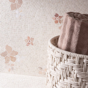 SAKURA captures the fleeting beauty of cherry blossoms in intricate waterjet mosaic. Blossoms drift across a swirling marble backdrop, blending delicate color play with natural stone elegance. Its companion, SAKURA FALLS, offers the same dynamic movement without floral details. Both designs are suitable for walls, showers, fireplace surrounds, and interior floors in non-freeze thaw areas. Available in three nature-inspired palettes.