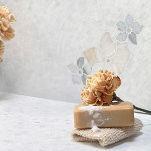 Type: Natural Stone Item Code: 25580427116 Description: Floral Sakura Bianco Antico Honed Interlocking 3 Part (A, B, C) Mosaic (19.625x31 - 4.225 sf/sheet) Availability: Special Order Lead Time: 1-2 weeks Purchase By: CARTON - $1,508.33, 8.45 sq. ft.