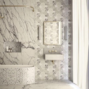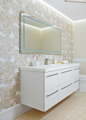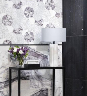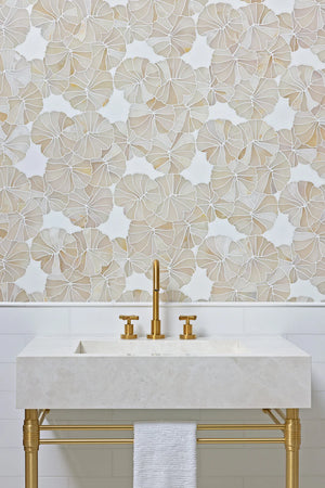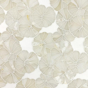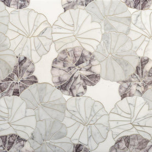 Thoreau described Walden pond as "tranquil and lovelier than diamonds," and ever since it has stood as a symbol of nature’s restorative and meditative quality. This mosaic traces the shape of peaceful lily pads floating atop still water. WALDEN is stocked in two elegant colorways, polished Bianco Onyx and honed Lilac, and may be customized with the glass or stone.